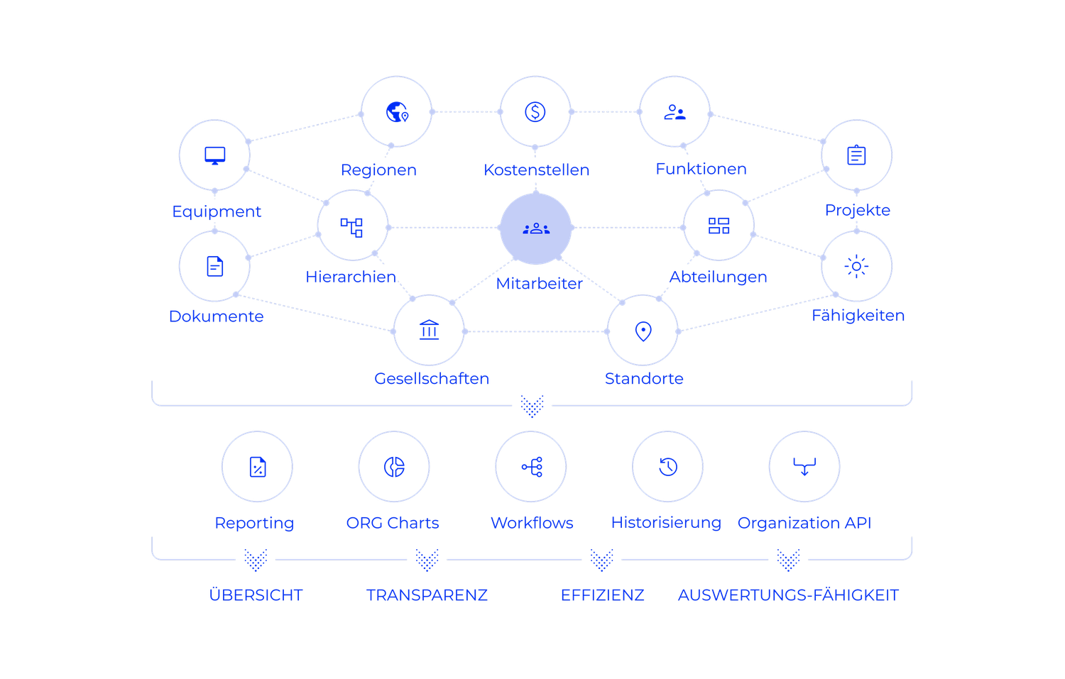 Verwandeln Sie starre Organigramme in strategische Entscheidungsgrundlagen. Verbinden Sie Mitarbeiter, Rollen und Hierarchien über Abteilungsgrenzen hinweg zu einer transparenten, einheitlichen Organisationsstruktur.